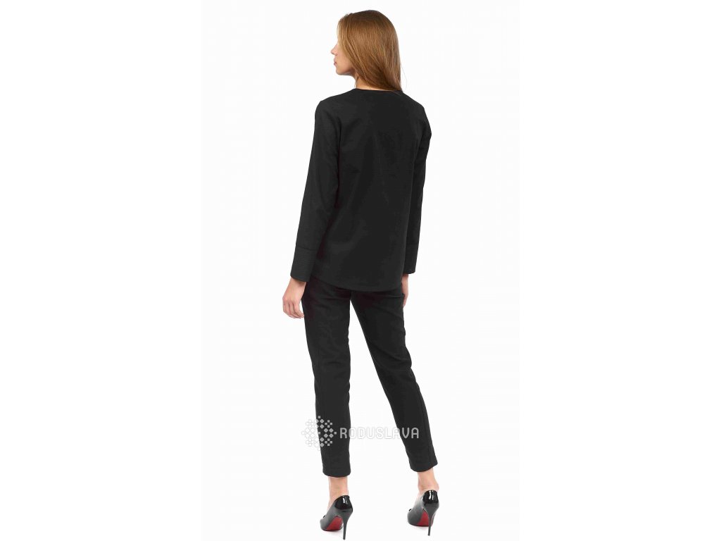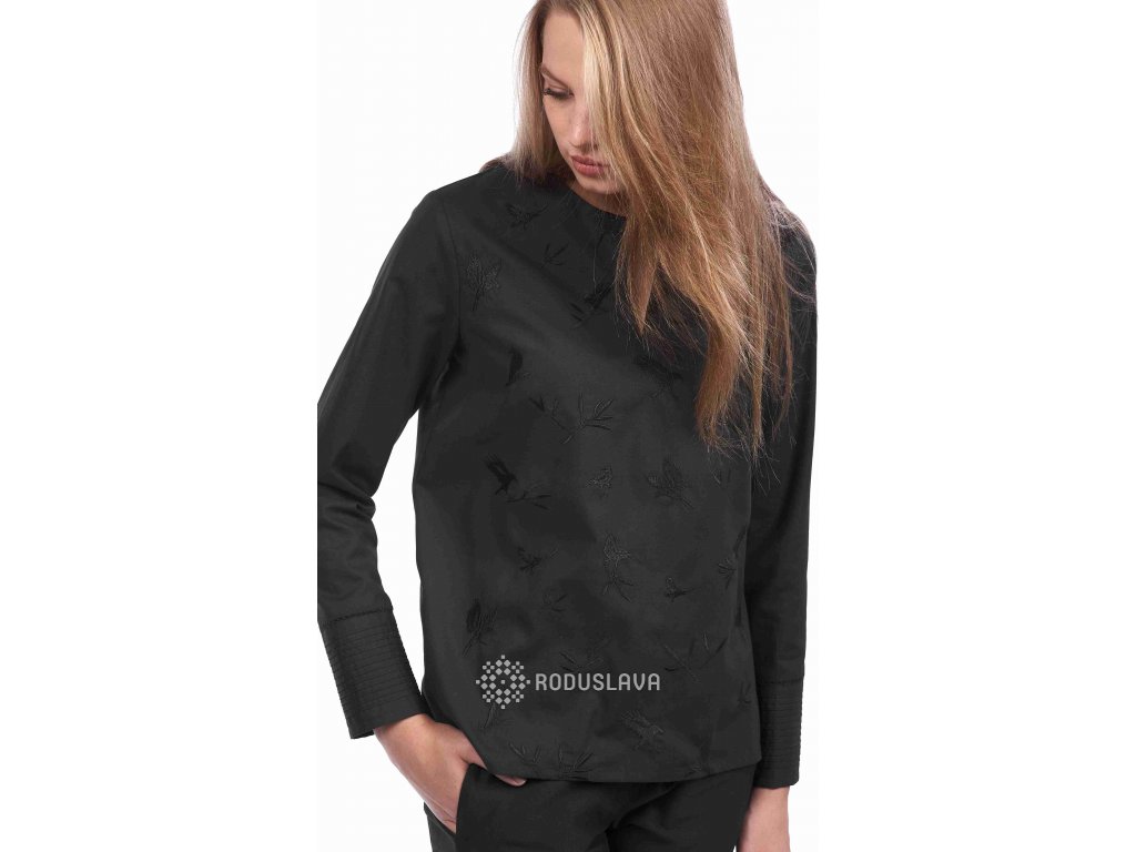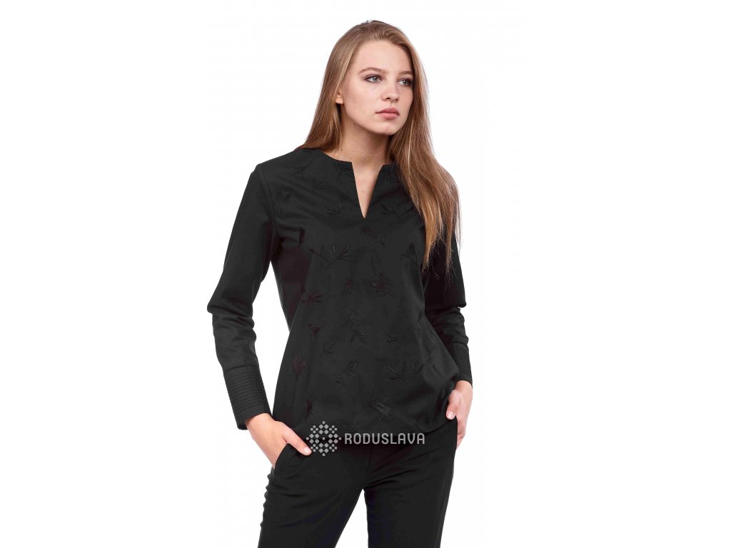 Dámská halenka v černé barvě, s výstřihem do V, s drobnými černými výšivkami na předním dílu, konce rukávů zdobí prošití.