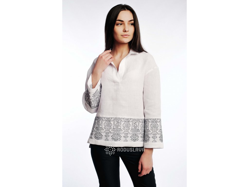 Dámská lněná halenka v bílé barvě, s výšivkou na rukávech a spodní části předního dílu. Halenka je s límečkem a výstřihem do V.